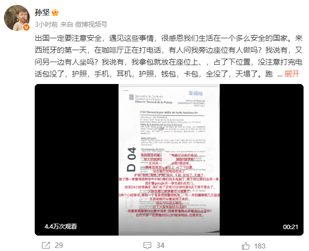 4月23日,演员孙坚发文称,其在西班牙巴塞罗那出门工作时遇到了小偷,自己的包丢了。